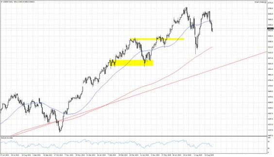 W przypadku technologicznego Nasdaqa spadki sięgały aż 2.7%, S&P500 spadł o 1.7%, a przemysłowy Dow Jones o 1%. W poniedziałkowy poranek notowania kontraktów terminowych na amerykańskie indeksy próbują częściowo odrabiać starty, choć w porównaniu do piątkowych spadków skala poprawy jest niewielka. Futures na S&P500 odbił do poziomu 5450 pkt. Podobnie sytuacja wygląda w przypadku niemieckiego Daxa, która zaliczył cofnięcie poniżej 18300 pkt. i dziś odrabia 100 pkt.
