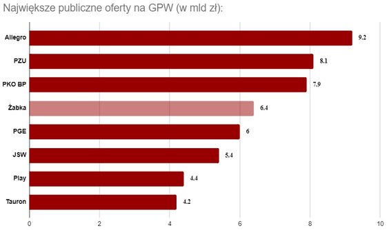 Żabka ma szansę poważnie namieszać na warszawskim parkiecie. Wszystko związane jest z dniem debiutu i tzw. "szybką ścieżką", która pozwala spółce na wejście do WIG20 już w dniu debiutu w trybie zmiany nadzwyczajnej. Istotne jest jednak spełnienie odpowiednich warunków, jak przekroczenie progu, który wynosi 5 proc. wartości kapitalizacji akcji w wolnym obrocie. Przy obecnej kapitalizacji indeksu wynoszącej 295,16 mld zł wiązałoby się to z wyceną pakietu na poziomie 14,76 mld zł. Oznacza to, że debiut Żabki musiałby się zakończyć 98,96% wzrostem pierwszego dnia. Ten scenariusz jest mało prawdopodobny, natomiast Żabka skorzysta z tej samej ścieżki i już w dniu debiutu spełni warunki wejścia do indeksu mWIG40. Równocześnie warto pamiętać, że jest to czwarte największe IPO w Europie w tym roku i czwarte największe w historii giełdy przy Książęcej. Tym samym Polska znajdzie się na radarach funduszy z całego świata i pytanie, jak wykorzysta to momentum.
