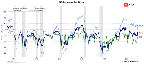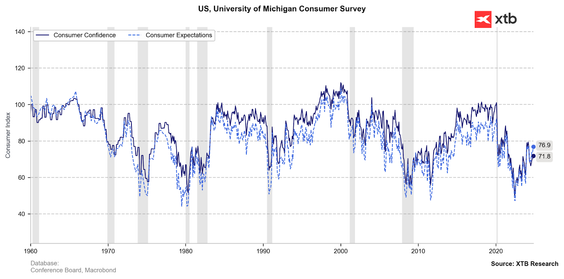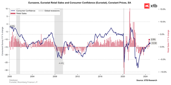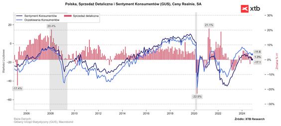 Patrząc na nastroje konsumentów w Europie i Stanach Zjednoczonych widać bardzo istotną poprawę względem poziomów z przełomu 2022 i 2023 roku, gdy pesymizm związany z kondycją globalnej gospodarki był rekordowy. To, w połączeniu z potencjalnie słabym Czarnym Piątkiem mogłoby stanowić pewne rozczarowanie i rozszerzyć dyskusję wokół zmian w trendach konsumenckich, ich wpływie na rynek, lub nawet potencjalnym odwróceniu ‘optymistycznego trendu’.