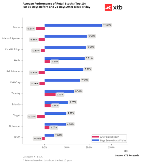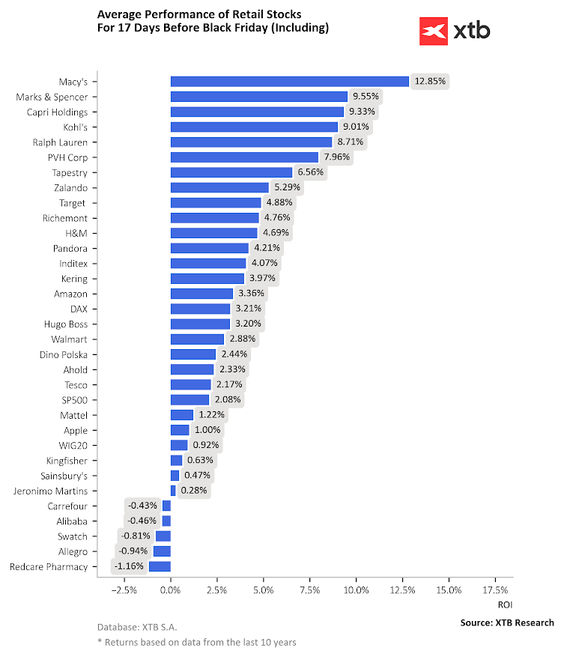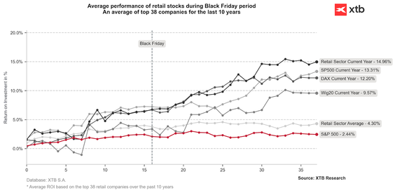 Akcje detalistów w ciągu ostatnich 10 lat radziły sobie lepiej, niż S&P 500, a aktywność inwestorów rosła zwykle na ok. 2 tygodnie przed Czarnym Piątkiem. W tym roku różnica ta, w dalszym ciągu korzystna dla sektora detalicznego nieznacznie osłabła. Źródło: XTB Research
