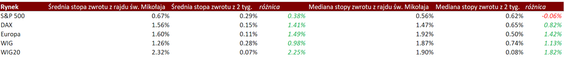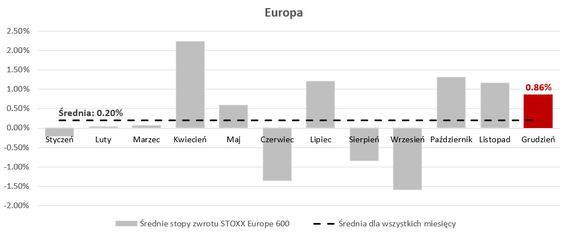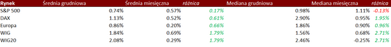 Przyjrzeliśmy się temu, jak kształtują się średnie miesięczne stopy zwrotu z amerykańskiej giełdy (wykorzystaliśmy indeks S&P 500), niemieckiego rynku (indeks DAX), szerokiego europejskiego rynku (indeks STOXX Europe 600), a także jak wygląda sytuacja na polskim rynku.