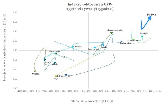 Na drugim końcu rankingu sektorowego znajdują się odzież, gry i informatyka. Z siłą trendu relatywnego na poziomie −85 proc. i pozycją relatywną wynoszącą −1,17 σ najsłabszym indeksem jest WIG-Odzież. Sektor ten stracił w ciągu tygodnia 3,6 proc. i mocno przesunął się w kierunku lewego dolnego narożnika wykresu siły relatywnej. Słabo zachowuje się również WIG-Gry, który spadł o ponad 2 proc., co przekłada się na zniżki zarówno siły trendu, jak i pozycji relatywnej.
