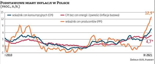 Najbliższe posiedzenie RPP zaplanowane jest na środę. Ankietowani przez „Parkiet" ekonomiści przeciętnie przewidują, że Rada podniesie stopę referencyjną NBP trzeci raz z rzędu, tym razem o 0,5 pkt proc., do 1,75 proc. Nie brakuje jednak głosów, że stopa ta wzrośnie od razu do 2 proc., a uczestnicy rynku finansowego zdają się oczekiwać nawet większej podwyżki. W notowaniach kontraktów terminowych na trzymiesięczny WIBOR wyceniony jest obecnie wzrost stopy referencyjnej NBP w ciągu miesiąca do około 2,7 proc., czyli aż o 1,5 pkt proc., ale oczekiwania te obejmują w jakiejś mierze także styczniowe posiedzenie rady. W dalszej perspektywie – ale jeszcze w 2022 r. – inwestorzy spodziewają się wzrostu głównej stopy procentowej w Polsce do około 3,25 proc. Jeszcze na początku października oczekiwali, że stopa ta zakończy przyszły rok na poziomie około 1,5 proc.