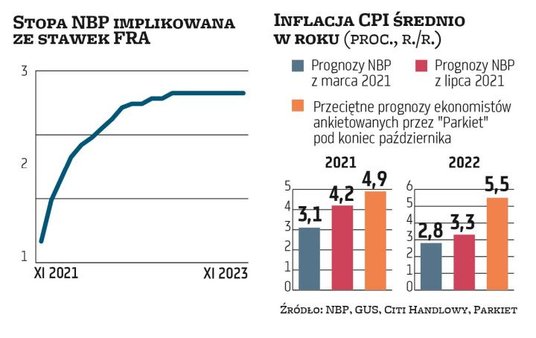 Bezpośrednią przesłanką dalszego zaostrzania polityki pieniężnej będą nowe prognozy Departamentu Analiz i Badań Ekonomicznych, które poznają członkowie RPP. Poprzednie, z lipca, sugerowały, że inflacja (przy założeniu braku zmian w polityce pieniężnej) w 2022 r. będzie, średnio rzecz biorąc, poniżej 3,5 proc., czyli górnej granicy pasma dopuszczalnych odchyleń od celu NBP (2,5 proc.). Obecnie ankietowani przez „Parkiet" ekonomiści przeciętnie oczekują, że inflacja w przyszłym roku wyniesie średnio 5,5 proc., czyli nawet więcej niż w br. (4,9 proc.). I nie będzie to jedynie konsekwencja wzrostu cen surowców oraz podwyżek cen prądu, na które krajowa polityka pieniężna nie ma wpływu. Poza pasmem dopuszczalnych odchyleń od celu NBP będzie prawdopodobnie także inflacja bazowa, nieobejmująca cen energii i żywności. – Nasze szacunki sugerują, że średnioroczna inflacja bazowa może w 2022 r. sięgnąć 4,7 proc., wobec 3,2 proc. przyjętych w projekcji inflacyjnej NBP w lipcu. Nawet przyjmując, że obecne prognozy są zbyt pesymistyczne, trudno poważnie wierzyć w szybki i samodzielny powrót wskaźników bazowych w pobliże celu inflacyjnego – zauważyli ekonomiści z Citi Handlowego.