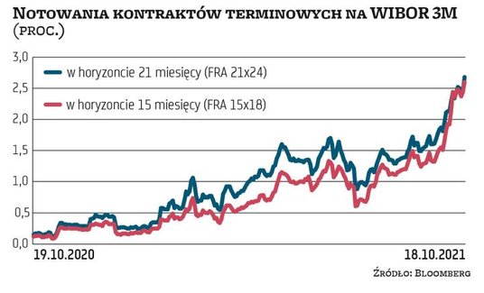 Stopa referencyjna NBP do końca 2022 r. dojdzie do 2,5 proc. z 0,5 proc. po październikowej podwyżce. Kolejny ruch w górę – i to aż o 0,5 pkt proc. – nastąpi już w listopadzie – takie są obecnie rynkowe oczekiwania pod adresem Rady Polityki Pieniężnej w świetle notowań kontraktów terminowych na trzymiesięczny WIBOR. Oczekiwania te narastały stopniowo już od wakacji, ale po podwyżce stopy referencyjnej przed dwoma tygodniami ruszyły ostro w górę. Jeszcze na początku miesiąca inwestorzy spodziewali się wzrostu tej stopy do końca 2022 r. do około 1,5 proc.
