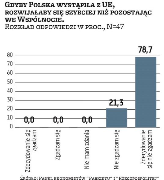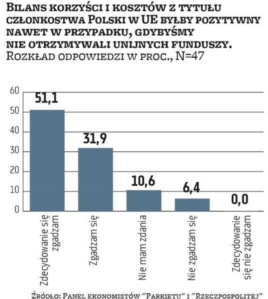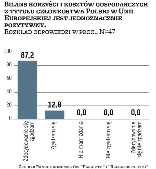 Takiej jednomyślności, jak w sprawie bilansu uczestnictwa Polski w UE, wśród uczestników panelu ekonomistów „Parkietu" i „Rzeczpospolitej" jeszcze nie było. To samo w sobie jest wymowne, bo od lipca ub.r. tej grupie wybitnych ekonomistów przedstawiliśmy do oceny już niemal 40 tez na różne tematy ekonomiczne. Zwykle te oceny były zróżnicowane. Do konsensusu blisko było w sprawie tzw. emerytury obywatelskiej, gdy ponad 80 proc. uczestników naszego panelu eksperckiego uznało, że to chybiona koncepcja. Tym razem wszyscy zgodzili się z tezą – w tym 87 proc. zdecydowanie – że „bilans korzyści i kosztów członkostwa Polski w UE jest jednoznacznie pozytywny". A przy tym udział w tej sondzie wzięło aż 47 ekonomistów, najwięcej w ponadrocznej już historii naszego panelu.