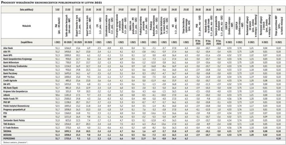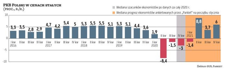 Ankietowani przez „Parkiet" pod koniec 2020 r. ekonomiści przeciętnie szacowali, że realny PKB zmalał o 3 proc. Wiosną dominowały jednak oceny, że aktywność w polskiej gospodarce spadnie o 4 proc., a nie brakowało też prognoz, że recesja będzie zdecydowanie głębsza. Organizacja ds. Współpracy Gospodarczej i Rozwoju (OECD) w czerwcu przewidywała, że PKB Polski załamie się o 7,4 proc. i to przy założeniu, że nie dojdzie do nawrotu pandemii. W scenariuszu z drugą falą Covid-19 spadek PKB miał sięgnąć 9,5 proc.