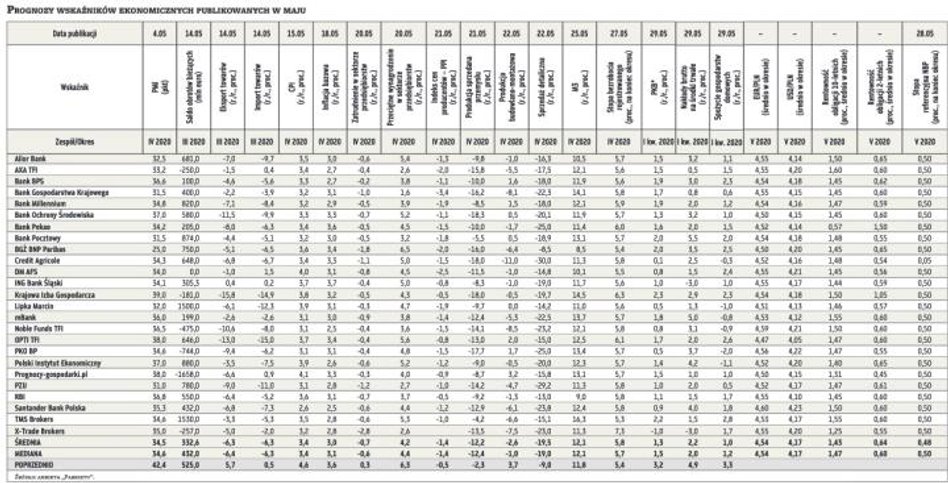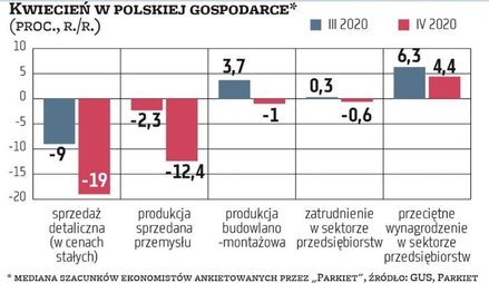 Sporo emocji mogą budzić także wyniki przemysłu. Ten sektor, inaczej niż usługi, nie był bezpośrednio dotknięty ograniczeniami aktywności ekonomicznej. Wiele firm wstrzymało jednak czasowo produkcję z powodu załamania popytu i wymuszonych przez zamknięcie szkół urlopów części pracowników. W ocenie ankietowanych przez „Parkiet" ekonomistów produkcja sprzedana przemysłu załamała się w kwietniu o 12,4 proc. rok do roku, po zniżce o 2,3 proc. w marcu. Byłby to odczyt najgorszy od lutego 2009 r., czyli apogeum globalnej recesji wywołanej kryzysem finansowym. Wtedy jednak polską gospodarkę stabilizował popyt wewnętrzny, w tym na usługi, który teraz jest największym obciążeniem.