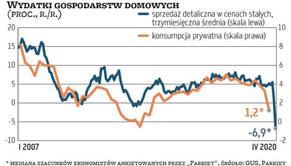 Wstrząsające mogą być przede wszystkim wyniki sprzedaży detalicznej. Już w marcu zmalała ona (w cenach stałych) o 9 proc. rok do roku, najbardziej od co najmniej 2006 r. W kwietniu, jak przeciętnie szacują ankietowani przez nas ekonomiści, załamała się już o 19 proc. rok do roku. W ocenie analityków z Credit Agricole Bank Polska spadek sprzedaży mógł być nawet głębszy, a i tak nie odzwierciedlał załamania szeroko rozumianej konsumpcji. Sprzedaż detaliczna jest bowiem mierzona przez GUS tylko w sklepach zatrudniających co najmniej 10 osób i nie obejmuje usług. Tymczasem, jak pokazują dane dotyczące transakcji kartami płatniczymi klientów Credit Agricole, wydatki na usługi były w kwietniu nawet o 40 proc. mniejsze niż w lutym. Stąd ekonomiści z tej instytucji oceniają, że nawet zakładając częściową odbudowę popytu w maju i czerwcu, konsumpcja ogółem w II kwartale załamie się o 20 proc. rok do roku. Dla porównania w I kwartale, jak szacują ankietowani przez nas ekonomiści, wydatki konsumpcyjne gospodarstw domowych zwiększyły się o 1,2 proc. rok do roku.