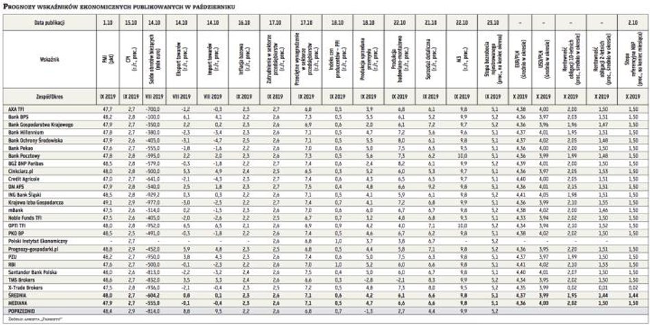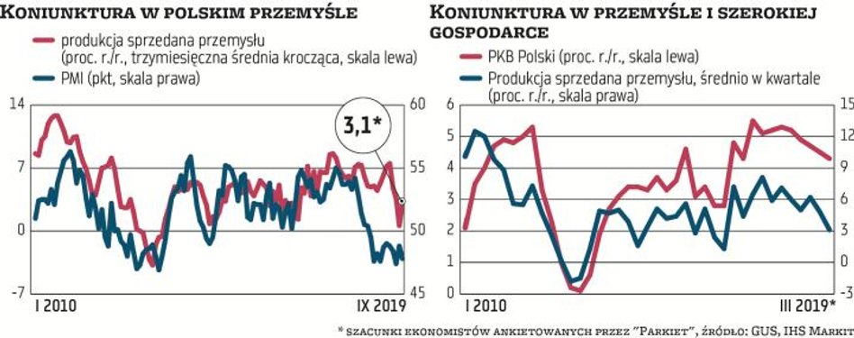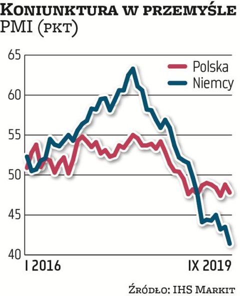 Taki pesymistyczny obraz sytuacji w przemyśle wyłania się z wrześniowego odczytu PMI, wskaźnika koniunktury bazującego na ankiecie wśród menedżerów logistyki przedsiębiorstw. Jak podała we wtorek firma IHS Markit, spadł on do 47,8 pkt z 48,8 pkt w sierpniu. Po wstępnych odczytach PMI w strefie euro, opublikowanych tydzień temu, ten wynik nie był zaskoczeniem dla ankietowanych przez „Parkiet" ekonomistów (patrz tabela). „PMI pokazuje, że wobec trwałości spowolnienia w strefie euro (...) problemy tamtejszego przetwórstwa zaczynają przelewać się na polską gospodarkę" – zauważyła w komentarzu Marta Petka-Zagajewska, kierownik zespołu analiz makroekonomicznych w PKO BP.