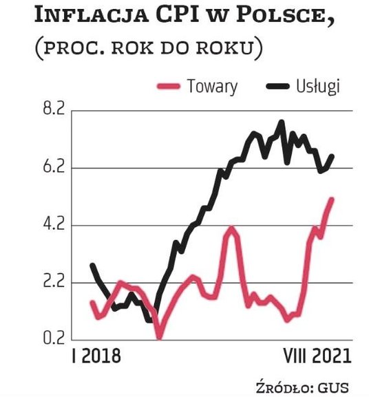 W sierpniu, podobnie jak przez cały czas od początku 2019 r., szybciej drożały usługi niż towary. Ceny tych pierwszych wzrosły o 6,6 proc. rok do roku, po 6,2 proc. w lipcu, podczas gdy tych drugich o 5,1 proc. rok do roku, po 4,6 proc. w lipcu. Mimo to to właśnie ceny towarów sprawiają, że inflacja przyśpiesza. Jeszcze na początku roku rosły one w tempie zaledwie 1 proc. rok do roku, podczas gdy usługi drożały nawet szybciej niż dziś, w tempie ponad 7 proc. rocznie.
