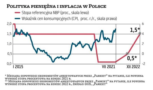 To prawdopodobnie oznaczałoby listopad, bo wtedy RPP pozna nowe prognozy inflacji autorstwa Departamentu Analiz Ekonomicznych NBP. Poprzednie, z lipca, sugerowały, że inflacja w 2022 r. spadnie tuż poniżej 3,5 proc., czyli górnej granicy pasma dopuszczalnych odchyleń od celu NBP (wynosi 2,5 proc.), a w 2023 r. będzie na podobnym poziomie. Rada uznała, że to stanowi argument na rzecz utrzymania stóp bez zmian. Listopadowe prognozy prawdopodobnie pokażą jednak wyższą ścieżkę inflacji, szczególnie jeśli będą już uwzględniały skutki zmian podatkowych planowanych w ramach tzw. Polskiego Ładu. Ekonomiści powszechnie sądzą bowiem, że przyczynią się one do wzmocnienia popytu konsumpcyjnego, a tym samym utrwalenia inflacji.