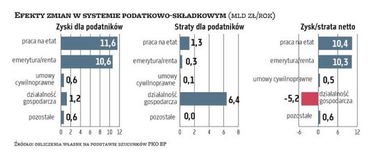 Dalej, dla osób zatrudnionych na podstawie umów cywilnoprawnych (np. zlecenie), zysk netto może wynieść ok. 0,5 mld zł rocznie, a dla grupy osób o innych źródłach dochodów 0,6 mld z. Na tym jednak lista „wygranych" się kończy, a jedyną grupą, która może być na minusie, i to dużym, są osoby prowadzące działalność gospodarczą.