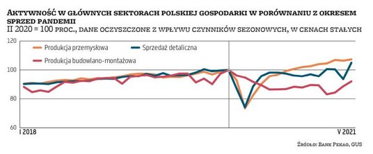 W II kwartale aktywność w polskiej gospodarce zwiększy się o ponad 2 proc. w stosunku do poprzedniego kwartału oraz o co najmniej 10–11 proc. w ujęciu rok do roku. Takie szacunki dominują wśród ekonomistów po publikacji serii danych dotyczących aktywności w maju. Wynik rok do roku będzie w dużej mierze odzwierciedlał załamanie PKB w II kwartale 2020 r., gdy gospodarkę sparaliżowały antyepidemiczne ograniczenia aktywności. Oczekiwany wzrost PKB kwartał do kwartału świadczy jednak o tym, że ożywienie to coś więcej niż tylko statystyczny artefakt. – Krajowa gospodarka znajduje się w fazie szybkiego wzrostu gospodarczego. Ożywienie dotarło już do wszystkich sektorów – przyznaje Marcin Czaplicki, ekonomista z PKO BP.