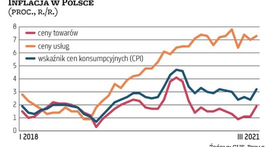 Z danych GUS wynika, że ceny usług wzrosły w marcu o 7,3 proc. rok do roku, po 7 proc. w lutym, a ceny towarów o 1,9 proc., po 1 proc. w lutym. Do przyspieszenia inflacji towarów przyczyniło się przede wszystkim odbicie cen ropy naftowej na globalnym rynkach. W połączeniu z niską bazą odniesienia sprzed roku, związaną z załamaniem cen tego surowca na początku pandemii, sprawiło to, że paliwa na polskich stacjach benzynowych były w marcu o 7,6 proc. droższe niż przed rokiem. Tymczasem jeszcze w lutym były o 3,7 proc tańsze niż rok wcześniej.