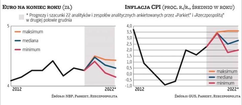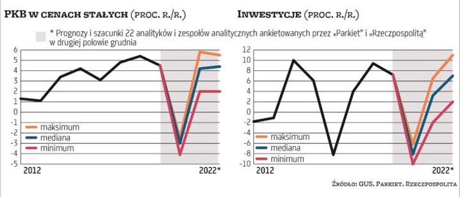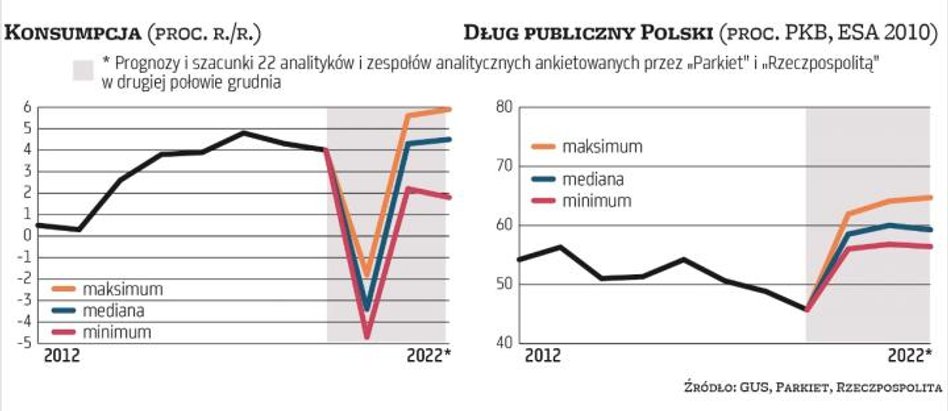 Uczestnicy noworocznej ankiety „Parkietu" i „Rzeczpospolitej" – łącznie 22 zespoły analityczne i indywidualni analitycy – przeciętnie oczekują, że tzw. spożycie w sektorze gospodarstw domowych, które ostatnio odpowiadało za niemal 60 proc. PKB, wzrośnie w 2021 r. o 4,3 proc., po zniżce o 3,4 proc. w 2020 r. Optymiści spodziewają się przy tym skoku konsumpcji o około 5,5 proc., pesymiści zaś o niewiele ponad 2 proc. Różnice między tymi scenariuszami wynikają m.in. z odmiennych oczekiwań co do inflacji. Obecnie ekonomiści przeciętnie przewidują, że w 2021 r. wyniesie ona średnio 2,5 proc. – dokładnie tyle, ile wynosi cel inflacyjny NBP – po 3,4 proc. w 2020 r. Większość przyznaje jednak, że jeśli te prognozy miałyby się okazać chybione, to bardziej prawdopodobne jest, że okażą się za niskie, niż że będą za wysokie. Wyższa od oczekiwań inflacja negatywnie wpływałaby na realną dynamikę płac i psułaby nastroje konsumentów.