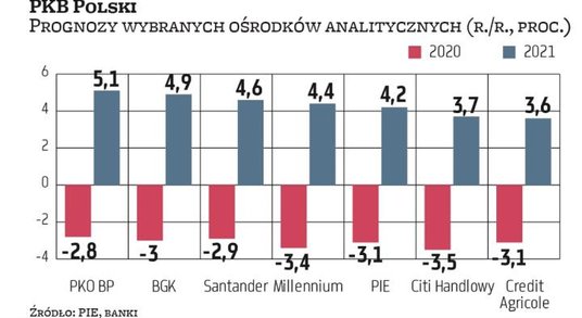 Ich prognozy należą do umiarkowanie optymistycznych. Wśród analityków z instytucji finansowych, którzy aktualizowali ostatnio swoje przewidywania na 2021 r., większego odbicia PKB Polski oczekują m.in. zespoły PKO BP, BGK, Santandera i Banku Millennium (patrz wykres), mniejszego zaś zespoły mBanku, Credit Agricole i Citi Handlowego. Dwa lata wzrostu gospodarki w tempie około 4 proc., w połączeniu z dość płytką recesją w 2020 r., wyróżniałyby jednak Polskę na tle innych państw UE. „Prognozy międzynarodowych instytucji wskazują, że PKB strefy euro do końca 2022 r. nie osiągnie poziomu sprzed pandemii. Przewiduje się, że spośród gospodarek rozwiniętych jedynie USA oraz Niemcy w tym horyzoncie osiągną poziom PKB obserwowany w 2019 r." – tłumaczą analitycy PIE. „To oznacza, że kryzys gospodarczy wywołany epidemią nie zatrzyma konwergencji poziomu rozwoju Polski do Europy Zachodniej" – dodają.