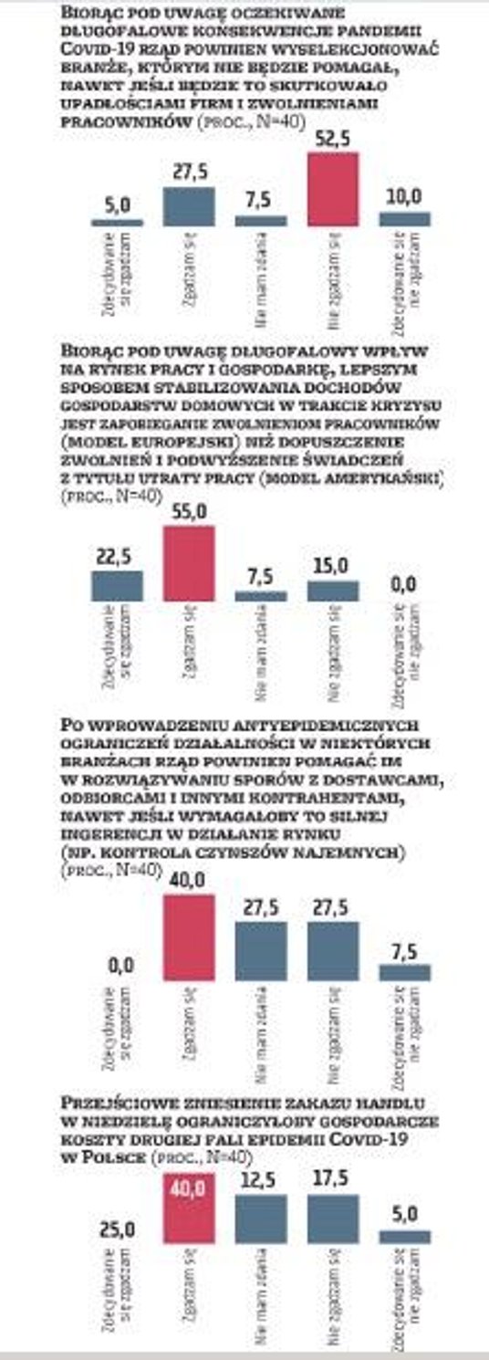 Uczestników naszego panelu zapytaliśmy też o to, czy czasowe choćby zniesienie zakazu handlu w niedzielę pomogłoby ograniczyć koszty gospodarcze epidemii Covid-19. Tak uważa część organizacji przedsiębiorców, a ich postulaty zyskały aprobatę Senatu, który przygotował projekt ustawy liberalizującej zasady handlu w okresie pandemii. Spośród ankietowanych przez nas ekonomistów postulat zawieszenia zakazu handlu w niedzielę popiera 65 proc. – To działanie wskazane zarówno ze względów ekonomicznych, jak i epidemiologicznych. Pozwoli na podtrzymanie zatrudnienia, a także na rozłożenie wizyt konsumentów w sklepach na większą liczbę dni – tłumaczy prof. Cieślik. Piotr Lewandowski, prezes Instytutu Badań Strukturalnych, jest innego zdania. – Umożliwienie handlu w niedzielę w środku pandemii to zły pomysł – mówi, przypominając, że w Czechach i na Słowacji, gdzie handel w niedzielę był dozwolony, w trakcie pandemii – jeszcze przed wiosennym lockdownem – został zakazany. Dlaczego? Bo pozytywne z gospodarczego punktu widzenia skutki otwarcia sklepów w niedzielę mogłyby wystąpić tylko przy założeniu, że zwiększyłoby to ich obroty. Ale to zwiększyłoby liczbę kontaktów międzyludzkich i przyspieszyło rozprzestrzenianie się epidemii. Gdyby zaś zniesienie zakazu handlu w niedzielę nie przyciągnęło do sklepów większej liczby klientów, to nie miałoby pozytywnego wpływu na obroty w handlu, a jednocześnie zwiększyłoby poziom strefy i frustracji pracowników tego sektora.