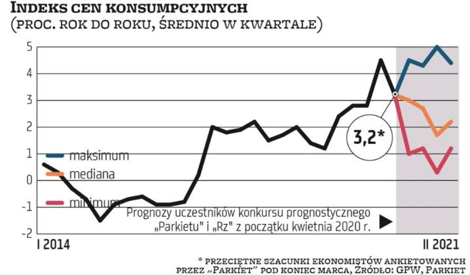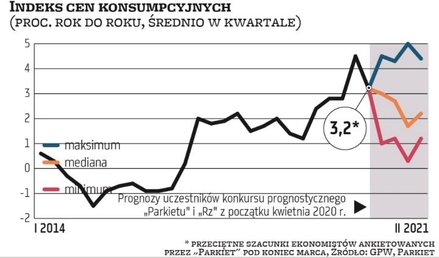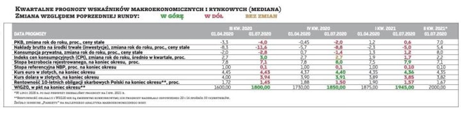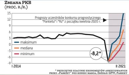 Przypływ pesymizmu jest o tyle zaskakujący, że kwartał temu o efektach tarcz antykryzysowych, które dopiero były wykuwane, można było tylko spekulować. Dziś wiadomo, że zapobiegły masowym upadłościom firm i fali zwolnień pracowników. Z drugiej strony w kwietniu nie można było przewidzieć, jak długo będą utrzymywane antyepidemiczne ograniczenia aktywności ekonomicznej. Uczestnicy konkursu przewidywali wtedy przeciętnie, że doprowadzą one do spadku PKB w II kwartale o 5,6 proc. rok do roku. Dziś ekonomiści szacują, że gospodarka skurczyła się o ponad 8 proc. Jednak oczekiwania na kolejne kwartały również są bardziej pesymistyczne niż na początku pandemii. Na przykład w kwietniu analitycy przeciętnie prognozowali, że w I kwartale 2021 r. PKB Polski wzrośnie o 1,2 proc. rok do roku, teraz oczekują jego spadku o 0,6 proc.