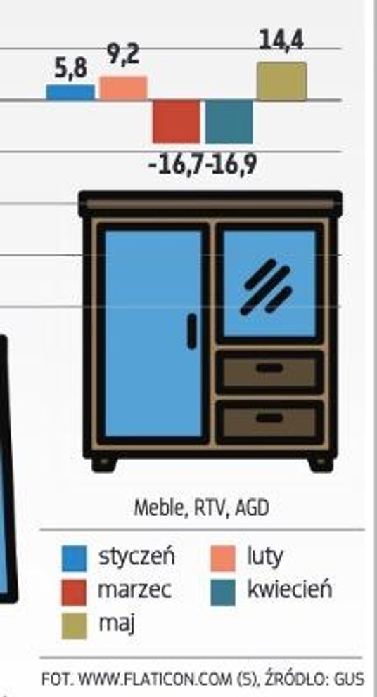 Otwarcie galerii handlowych z początkiem maja doprowadziło do silnego odbicia, zwłaszcza popytu na odzież i obuwie. W stosunku do kwietnia sprzedaż w tej kategorii wzrosła aż o 131,4 proc. (dane te obejmują częściowo handel internetowy). Popyt na meble i sprzęt RTV oraz AGD był w maju tak duży, że nawet