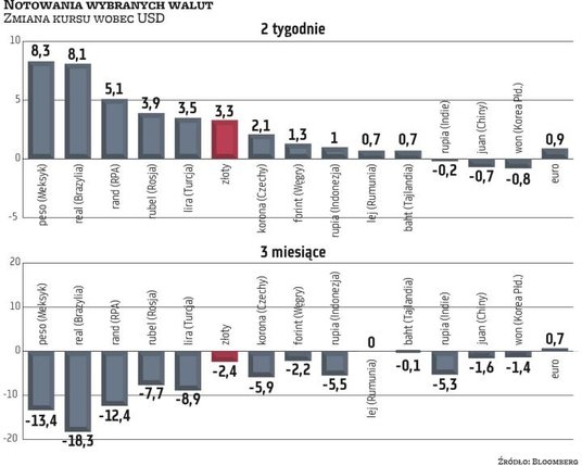 Wśród ogółu walut państw zaliczanych do rynków wschodzących złoty liderem nie jest. Waluty Meksyku, RPA czy Brazylii zyskały na wartości sporo więcej. Z drugiej strony wcześniej zostały mocniej przecenione. Stąd od początku paniki na rynkach wywołanej wybuchem pandemii Covid-19 do dzisiaj złoty osłabił się wobec dolara o około 2,4 proc., a rand, peso i real o ponad 12 proc. (patrz wykres). Polska waluta nie musiała odrabiać tak dużych strat, a w tym kontekście jej aprecjacja w ostatnich dniach jest znacząca. Jak to tłumaczyć?