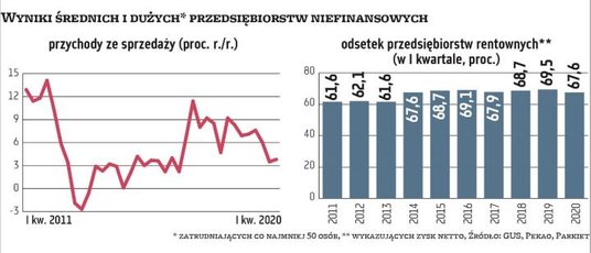 Wynik finansowy netto przedsiębiorstw niefinansowych z co najmniej 50 pracownikami załamał się w I kwartale o blisko 29 proc. rok do roku, do niespełna 18,6 mld zł. W tym okresie roku niższy był po raz ostatni siedem lat temu. Rentowność netto przedsiębiorstw wyniosła 2,4 proc., najmniej od 2009 r., w porównaniu z 3,4 proc. rok wcześniej. Zysk netto wykazało w pierwszych trzech miesiącach 67,6 proc. ogółu przedsiębiorstw, w porównaniu z 69,5 proc. rok wcześniej. Odsetek rentownych firm niższy był poprzednio w I kwartale 2013 r., gdy polska gospodarka zmagała się z konsekwencjami recesji w strefie euro związanej z kryzysem fiskalnym oraz zapaścią inwestycji po boomie związanym z organizacją Euro 2012.