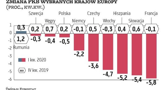 Gospodarka Niemiec skurczyła się w pierwszym kwartale o 2,2 proc. kw./kw. – mówią wstępne dane. Ten spadek był co prawda największy od pierwszego kwartału 2009 r., ale zgodny z prognozami analityków. Dane za czwarty kwartał zrewidowano w dół – z 0 proc. do minus 0,1 proc. Oznacza to, że Niemcy weszły już w techniczną recesję. Licząc rok do roku, niemiecki PKB spadł w pierwszym kwartale o 2,3 proc. (spadek bez uwzględniania czynników sezonowych wyniósł 1,9 proc.). Spadek PKB powinien być dużo większy w drugim kwartale. Instytut Ifo spodziewa się, że wyniesie on 12,2 proc. Komisja Europejska prognozuje, że niemiecki PKB spadnie w 2020 r. o 6,5 proc. Część ekonomistów wskazuje, że Niemcy wchodzą w kryzys w stosunkowo słabszej kondycji niż w 2008 r. – W 2008 r. Niemcy dopiero co wdrożyły reformy strukturalne i to był początek pozytywnego cyklu. Tym razem mieliśmy do czynienia z zakończeniem bardzo dojrzałego cyklu, a gospodarka potrzebowała inwestycji i nowych reform. Wówczas kraje azjatyckie, które w ograniczonym stopniu były poszkodowane kryzysem, szybko się odbiły i pomogły w ożywieniu niemieckiego eksportu – przypomina Carsten Brzeski, ekonomista ING. W piątek opublikowano też dane o PKB kilku państw naszego regionu. W Czechach spadł on w pierwszym kwartale o 3,6 proc. kw./kw. i o 2,2 proc. r./r. Na Węgrzech w tym czasie zmniejszył się o 0,4 proc. kw./kw., ale wzrósł o 2,2 proc. r./r. Na Słowacji podano tylko dane liczone rok do roku. PKB naszego południowego sąsiada zmniejszył się w pierwszym kwartale o 3,9 proc. r./r., po wzroście o 2 proc. w końcówce 2019 r. Gospodarki Słowacji, Czech i Węgier są bardzo mocno powiązane z niemieckim przemysłem. Zaszkodziło im więc pogorszenie koniunktury gospodarczej w Europie Zachodniej. Dane o PKB za pierwszy kwartał opublikowała też w piątek rano Rumunia. Wzrost gospodarczy zwolnił tam do 2,3 proc. r./r., z 4,3 proc. odnotowanych w czwartym kwartale 2019 r. HK