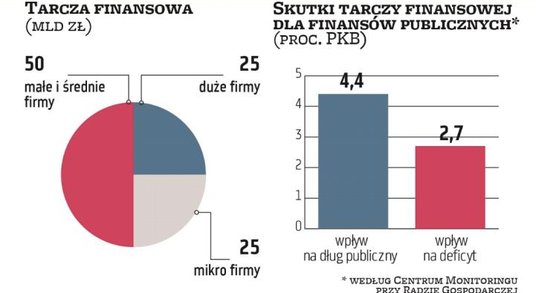 Znaczący wzrost długu oczekiwany jest także w 2021 r., bo wówczas w finansach publicznych uwidoczni się efekt tzw. tarczy finansowej (czyli pożyczek dla firm o wartości 100 mld zł, z czego ok. 60 proc. zostanie umorzonych). Finansowanie tych pożyczek ma się odbywać poza sektorem finansów publicznych (PFR ma wyemitować obligacje, które pośrednio skupi NBP), jednak już ich umorzenie będzie traktowane jako dług publiczny. Centrum Monitoringu Sytuacji Gospodarczej przy Radzie Przedsiębiorczości wyliczyło, że tarcza finansowa zwiększy dług (w ujęciu unijnym) o kolejne 4,4 proc. PKB, a deficyt – o dalsze 2,7 proc. PKB.