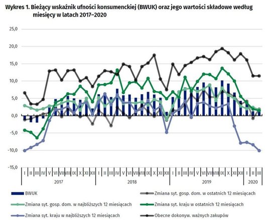 BWUK rekordowy poziom 10,2 pkt osiągnął we wrześniu 2019 r. i od tego czasu jest w trendzie spadkowym. Tak nisko, jak w lutym i marcu, był poprzednio w grudniu 2018 r., gdy Polacy obawiali się skoku cen energii. Pogorszenie nastrojów na przełomie 2019 i 2020 r. również można tłumaczyć przyspieszającą inflacją oraz spowolnieniem gospodarczym.