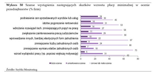 Większość przedsiębiorstw (56 proc.) zadeklarowała, że ta zmiana kosztów pracy nie wpłynie zauważalnie na ich kondycję. Około 40 proc. było innego zdania, ale według analityków NBP „nawet w tych przypadkach realne skutki podwyżki płacy minimalnej będą ograniczone, obejmujące co najwyżej kilkanaście procent respondentów, i to przeważnie firm małych".