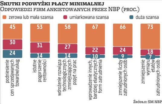 W ramach ostatniej edycji cokwartalnych badań wśród firm, prowadzonej w grudniu, NBP zadał im kilka pytań dotyczących reakcji na wzrost płacy minimalnej w 2020 r. o niemal 16 proc., do 2600 zł brutto. Większość przedsiębiorstw (56 proc.) zadeklarowała, że ta zmiana kosztów pracy nie wpłynie zauważalnie na ich kondycję. Około 40 proc. było innego zdania, ale według analityków NBP „nawet w tych przypadkach realne skutki podwyżki płacy minimalnej będą ograniczone, obejmujące co najwyżej kilkanaście procent respondentów, i to przeważnie firm małych".