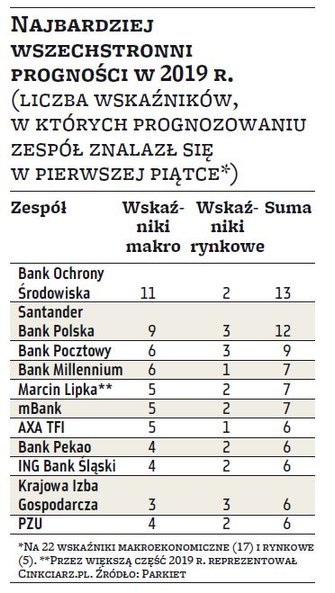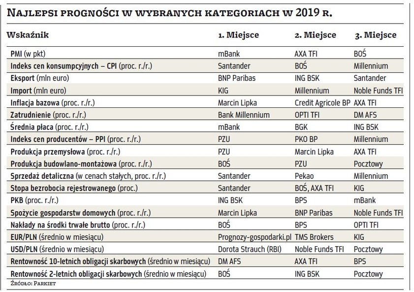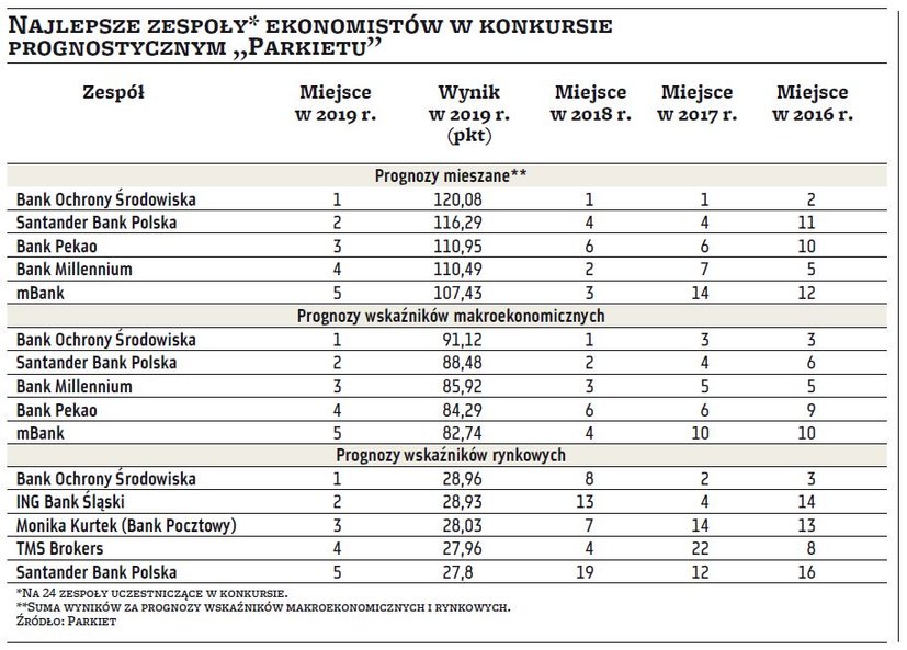 W konkursie prognostycznym „Parkietu" w 2019 r. udział brało od 23 do 25 zespołów i indywidualnych analityków z banków, domów maklerskich i TFI. Uczestnicy rywalizacji pod koniec każdego miesiąca przesyłali swoje szacunki dotyczące odczytów najważniejszych publikowanych w kolejnym miesiącu wskaźników makroekonomicznych (a więc dotyczących koniunktury w poprzednim kwartale lub miesiącu). Ich liczba wahała się od 14 do 17, ze względu na to, że w niektórych miesiącach ukazują się istotne dane kwartalne. Dodatkowo uczestnicy przesyłali prognozy dotyczące kształtowania się pięciu wskaźników rynkowych (patrz tabela) w kolejnym miesiącu. Za każdą prognozę można było zdobyć od 0 do 1 pkt w zależności od tego, jak wypadła ona na tle faktycznego odczytu danego wskaźnika oraz prognoz innych uczestników. W rankingu ogólnym prognozy wszystkich zmiennych mają jednakową wagę. W praktyce więc większy wpływ na końcowy rezultat mają prognozy wskaźników makroekonomicznych, których jest więcej. Zwycięzca konkursu otrzyma tytuł najlepszego ekonomisty roku na naszej gali „Byki i Niedźwiedzie". GS