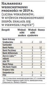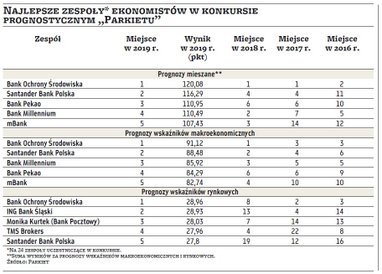 W 2019 r. duetowi z BOŚ po piętach deptali ekonomiści z Santander Bank Polska (Maciej Reluga, Piotr Bielski, Marcin Luziński, Wojciech Mazurkiewicz, Grzegorz Ogonek i Marcin Sulewski), którzy od lat są w czołówce naszego rankingu. Trzy z poprzednich pięciu edycji konkursu kończyli na czwartym miejscu, raz byli na szóstej lokacie. Tym razem zespół Santandera niewiele dzieliło od wygranej: zwyciężył w dwóch kwartałach. Dla porównania, ekonomiści z BOŚ, choć średnio byli lepsi, zwyciężyli w jednym kwartale.