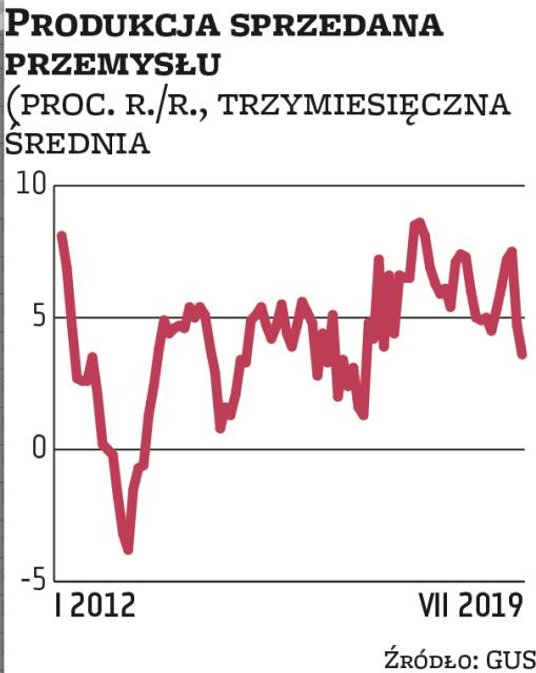 Lipcowe odczyty wypadają również słabo w zestawieniu z wynikami gospodarki w pierwszych pięciu miesiącach roku. W tym okresie produkcja budowlana rosła średnio w tempie 11,2 proc. rocznie, a produkcja przemysłowa w tempie 7,1 proc. rocznie, a więc nawet szybciej niż w latach 2017–2018. To kontrastowało z trwającą już od niemal roku recesją w przemyśle Niemiec, głównego partnera handlowego Polski. – Przemysł zrzucił pancerną zbroję – napisał w komentarzu do środowych danych Jakub Borowski, główny ekonomista Credit Agricole Bank Polska, nawiązując do dotychczasowej odporności polskiego sektora przemysłowego na spowolnienie za Odrą.