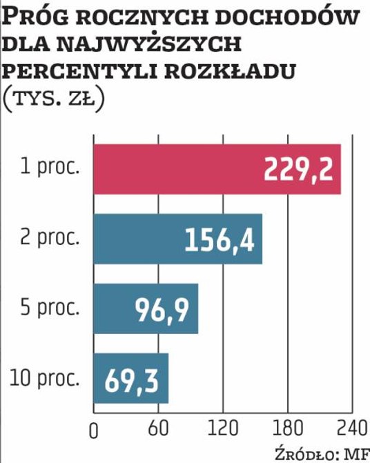 Z danych MF można jednak wyciągnąć także inne wnioski. W 2016 r. wystarczył dochód na poziomie 69,3 tys. zł brutto rocznie (5,8 tys. zł miesięcznie), aby znaleźć się wśród 10 proc. najlepiej zarabiających Polaków. Aby należeć do 5 proc. osób o najwyższych dochodach, wystarczyło zarabiać 96,9 tys. zł rocznie (8,1 tys. zł miesięcznie). Biorąc pod uwagę przeciętne wynagrodzenie w sektorze przedsiębiorstw, które wtedy wynosiło 4,3 tys. zł brutto miesięcznie, dochody najlepiej opłacanych trudno uznać za niebotyczne. Za znaczące zróżnicowanie dochodów odpowiadają w Polsce głównie prowadzący działalność gospodarczą (i płacących liniowy PIT). W tej grupie średni dochód roczny to 231 tys. zł, ale też rozpiętości są wyjątkowo duże: 10 proc. podatników o najwyższych dochodach odpowiada za 60 proc. ogółu dochodów tej grupy. – To jest naturalne, że przedsiębiorcy mają mocno zróżnicowane dochody. Zdarzają się straty, ryzyko jest większe – uważa dr hab. Marek Kośny, profesor na UE we Wrocławiu.