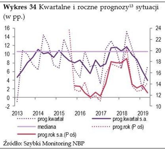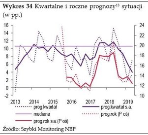 „Silnie osłabienie wskaźnika prognoz eksportu sugeruje, że główną przyczyną oczekiwanego pogorszenia uwarunkowań popytowych w II kw. są gorsze prognozy popytu zagranicznego, wynikające z przewidywań niższego wzrostu gospodarczego w strefie euro, w tym w gospodarce niemieckiej" – napisali ekonomiści z banku centralnego.
