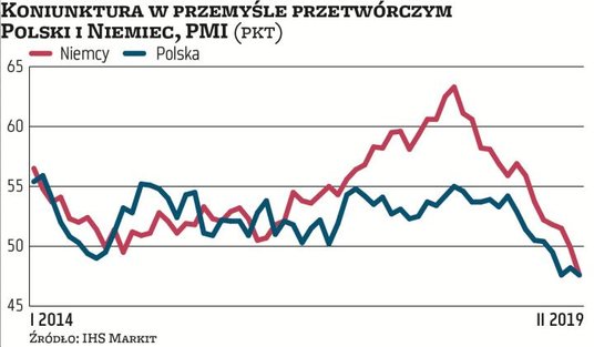 Optymizmem nie napawają też szczegółowe wyniki ankiety, na której opiera się PMI. Firmy zgłosiły m.in. równie silny spadek produkcji, jak w styczniu, który był pod tym względem najgorszy od niemal dekady. Była to reakcja przedsiębiorstw na malejącą wartość otrzymywanych zamówień, szczególnie z zagranicy. Trevor Balchin z firmy IHS Markit, która oblicza PMI, podkreślił, że ankietowani menedżerowie jako główne źródło osłabienia popytu wskazują Niemcy. A zdaniem ekonomistów z ING Banku Śląskiego nad Renem nie zanosi się na rychłą poprawę koniunktury.