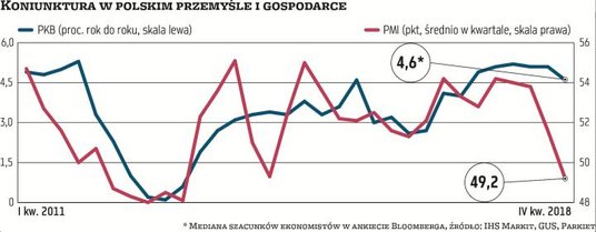 W listopadzie PMI był nieznacznie poniżej granicy 50 pkt. Gdy poprzednio był na podobnym poziomie, w 2014 r., w szerokiej gospodarce nie było widać oznak spowolnienia. Grudniowy odczyt jest jednak bardziej niepokojący. PMI znalazł się bowiem na poziomie najniższym od kwietnia 2013 r., gdy polska gospodarka faktycznie była na granicy stagnacji.