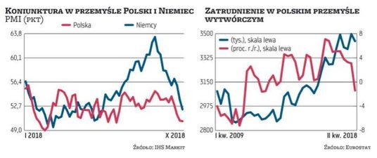 Menedżerowie ankietowani przez IHS Markit odpowiadają m.in. na pytania o to, jak zmieniły się w ich firmach w porównaniu z poprzednim miesiącem produkcja, wartość zamówień, zatrudnienie, zaległości produkcyjne itp. W październiku polskie firmy przemysłowe zgłosiły najmniejszy od dwóch lat wzrost produkcji. Odnotowały też niewielki wzrost wartości nowych zamówień, po spadku we wrześniu. Ale wartość zamówień zagranicznych zmalała trzeci raz z rzędu, najbardziej od sześciu lat. To oznacza, że głównym źródłem pogorszenia koniunktury w polskim przemyśle jest spowolnienie w tym sektorze w strefie euro, szczególnie zaś w Niemczech, gdzie PMI maleje niemal nieprzerwanie od początku roku.