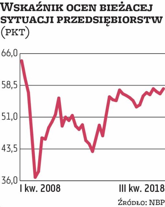 We wrześniu przeciętne wynagrodzenie w sektorze przedsiębiorstw zwiększyło się o 6,7 proc. rok do roku. Wzrost płac hamuje od czerwca, gdy wynosił 7,5 proc. rocznie. Dzieje się tak, choć badania NBP wskazują na silny wciąż popyt na pracę. Po spadku w dwóch poprzednich kwartałach wskaźnik prognoz zatrudnienia na bieżący kwartał utrzymał się na niezmienionym poziomie. – Co kluczowe, wskaźnik ten cały czas jest na wysokich poziomach, sugerując utrzymywanie się wysokiego popytu na pracę. Problemem może być jednak jego zaspokojenie – zauważa Piękoś. Dlaczego zatem wzrost płac hamuje? Zdaniem Janeckiego jednym z wyjaśnień mogą być pracownicze plany kapitałowe, które zaczną być tworzone w 2019 r., zwiększając koszty pracy firm nawet przy niezmienionych płacach.