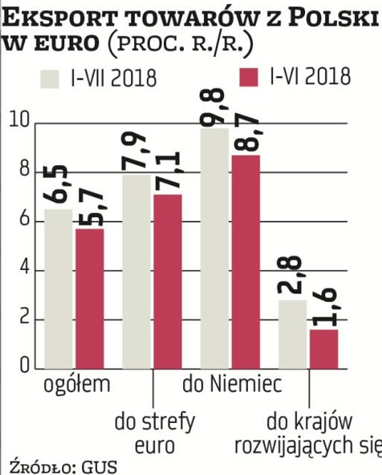 Tę hipotezę może potwierdzać to, że w lipcu wyraźnie przyspieszył eksport do Niemiec, dokąd trafia lwia część produkowanych w Polsce komponentów do produkcji aut. Po lipcu sprzedaż towarów do Niemiec była o 9,8 proc. większa niż w podobnym okresie poprzedniego roku, podczas gdy po czerwcu wzrost wynosił 8,7 proc. rok do roku. W efekcie udział naszego zachodniego sąsiada w polskim eksporcie zwiększył się do 28 proc., z 27,2 proc. w pierwszych siedmiu miesiącach ub.r.
