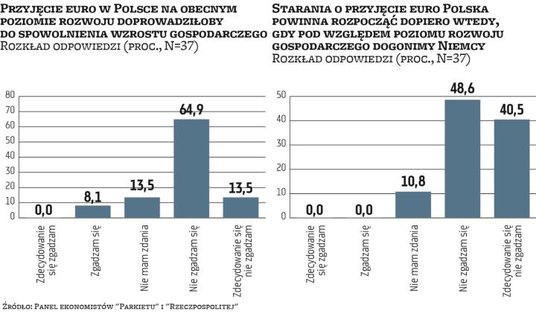 To, że uczestnicy naszego panelu ekonomistów nie zgadzają się z tym, że Polska do strefy euro dojrzeje dopiero wtedy, gdy dogoni Niemcy, nie oznacza, że możemy przyjąć tę walutę w dowolnym momencie. Część z nich, chociaż niewielka, podziela bowiem obawy prezesa NBP, że dołączenie do unii walutowej już teraz doprowadziłoby do spowolnienia wzrostu polskiej gospodarki. Z taką tezą zgodziło się 8 proc. ankietowanych. Większość – ponad 78 proc. – takiego ryzyka jednak nie widzi albo sądzi, że możemy je zminimalizować odpowiednio się przygotowując. Chodzi przede wszystkim o to, aby stworzyć alternatywne wobec polityki pieniężnej mechanizmy schładzania gospodarki, w razie gdyby groziło jej przegrzanie (i nadmierna inflacja).