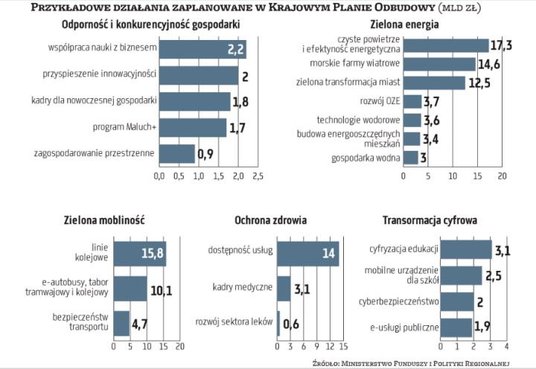 Krajowy Plan Odbudowy to łącznie ok. 35,4 mld euro (ok. 160 mld zł), z czego 23,9 mld euro to bezzwrotne granty, a 11,5 mld euro – pożyczki (w tym ok. 2,2 mld euro ma być „spłacane" nie przez ostatecznych beneficjentów, ale przez budżet państwa). Ministerstwo Finansów liczy, że realizacja KPO nieco złagodzi nadchodzące spowolnienie gospodarcze i dzięki wzrostowi inwestycji zwiększy też tempo rozwoju. Resort szacuje, że w 2022 r. KPO doda więc do dynamiki PKB 0,1 pkt proc., w 2023 r. – 0,6 pkt proc., a w kolejnych latach nawet po 1 pkt proc.
