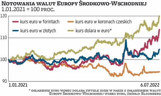 Osłabienie złotego część analityków wiązała początkowo właśnie z danymi z polskiej gospodarki. Ich konsekwencją była bowiem lekka korekta rynkowych oczekiwań co do dalszej ścieżki stóp procentowych. We wtorek i w środę złoty tracił jednak na wartości przede wszystkim pod wpływem czynników globalnych. Obawy, że strefie euro i USA grozi recesja, spowodowały wzrost awersji do ryzyka, który osłabił większość walut państw zaliczanych do koszyka rynków wschodzących. Dodatkowo, jak zauważyli w środowym komentarzu analitycy z PKO BP, „rosnące obawy przed przymusowym racjonowaniem surowców energetycznych w UE, co w konsekwencji prowadziłoby do recesji, zmniejszają szanse na duże podwyżki stóp procentowych w strefie euro”. To potęguje wynikające z awersji do ryzyka osłabienie euro wobec dolara, które z kolei tradycyjnie pociąga za sobą osłabienie złotego wobec euro.