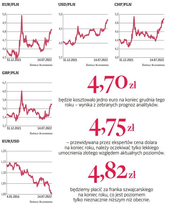 Z kolei kursy euro i franka szwajcarskiego osiągnęły poziomy nienotowane od początku marca bieżącego roku (było to odpowiednio 4,84 zł i 4,93 zł), czyli okresu krótko po napaści Rosji na Ukrainę, gdy rynkiem rządziła panika. Jakie są przewidywania ekspertów dla polskiej waluty na najbliższe miesiące i cały 2022 rok?