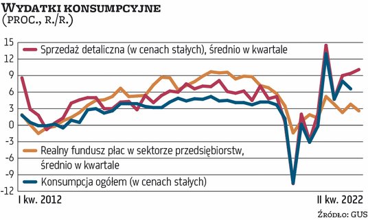 Wzrost sprzedaży w ujęciu rok do roku był w czerwcu najsłabszy od lutego 2021 r., ale i tak maluje zbyt optymistyczny obraz koniunktury w handlu detalicznym. Po oczyszczeniu z wpływu czynników sezonowych sprzedaż w czerwcu była aż o 3,2 proc. niższa niż w maju. Podobną lub większą zniżkę sprzedaży miesiąc do miesiąca GUS odnotował poprzednio w grudniu 2021 r., a wcześniej w kwietniu 2021 r. oraz marcu i kwietniu 2020 r. Te trzy ostatnie przypadki łączy to, że obowiązywały wówczas antyepidemiczne ograniczenia. W grudniu 2021 r. ich nie było, a załamanie popytu ekonomiści wiązali z wysoką inflacją i słabnącymi nastrojami konsumentów. Tak samo tłumaczyć można czerwcowe wyniki handlu. Przy czym sytuacja finansowa gospodarstw domowych jest obecnie gorsza niż w grudniu. Od maja wzrost płac w sektorze przedsiębiorstw, który co do zasady jest wyższy niż w szerokiej gospodarce, nie nadąża za wzrostem cen towarów i usług konsumpcyjnych. W czerwcu niższy od inflacji był już nawet wzrost funduszu płac w sektorze przedsiębiorstw (tzn. miary dochodów wszystkich zatrudnionych). Znalazło to odzwierciedlenie w obliczanym przez GUS wskaźniku nastrojów konsumenckich, który znalazł się najniżej w historii. Wyniki handlu detalicznego byłyby zapewne jeszcze słabsze, gdyby nie to, że popyt na niektóre towary podbijany jest przez uchodźców z Ukrainy.
