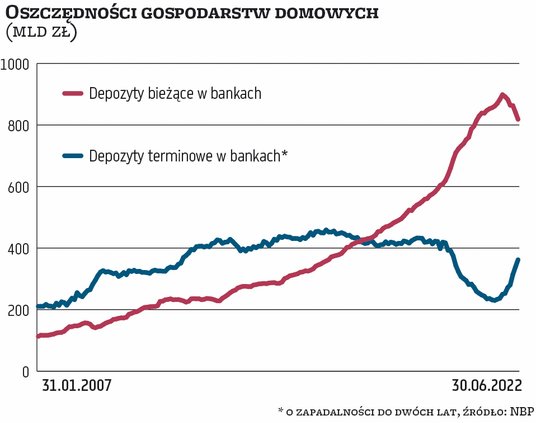 Wartość depozytów bieżących gospodarstw domowych stopniała od początku roku do końca czerwca o ponad 80 mld zł, czyli około 9 proc. Duża część tej kwoty trafiła na lokaty terminowe, na których w połowie roku znajdowało się o 55 mld zł – czyli 37 proc. – więcej niż na koniec 2021 r. Ta zmiana w strukturze aktywów gospodarstw domowych świadczy o ich rosnącej skłonności do oszczędzania zamiast wydawania. To zaś jeden z mechanizmów oddziaływania polityki pieniężnej na gospodarkę i w rezultacie na inflację.