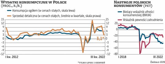 W sierpniu, jak informował GUS we wtorek, przeciętne wynagrodzenie w przedsiębiorstwach wzrosło o 12,7 proc. rok do roku, podczas gdy wskaźnik cen konsumpcyjnych podskoczył o 16,1 proc. rok do roku. To oznacza, że siła nabywcza przeciętnego wynagrodzenia zmalała o 3,4 proc. rok do roku, najbardziej od co najmniej 2000 r. To czynnik, który bezpośrednio wpływa na możliwości konsumpcyjne gospodarstw domowych. Na to jednak nakładają się minorowe nastroje konsumentów, skłaniające ich do zaciskania pasa.