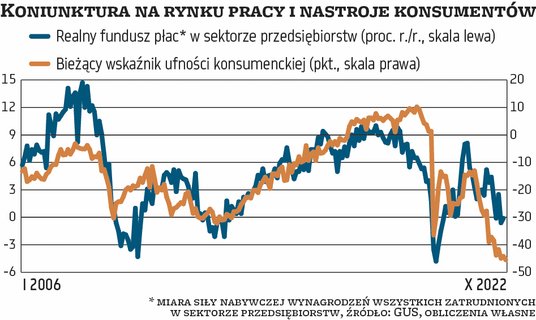 W całym sektorze przedsiębiorstw, który obejmuje podmioty z co najmniej dziesięcioma pracownikami i charakteryzuje się nieco wyższą dynamiką wynagrodzeń niż szeroka gospodarka, płace we wrześniu nie dotrzymały kroku inflacji, która wyniosła 17,2 proc. rok do roku. Spadek siły nabywczej wynagrodzeń to czynnik, który będzie negatywnie wpływał na realną konsumpcję zarówno bezpośrednio, jak i przez gorsze nastroje konsumentów. W październiku, jak podał w środę GUS, były one najsłabsze w historii badań.