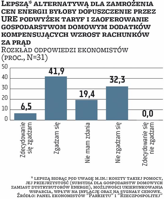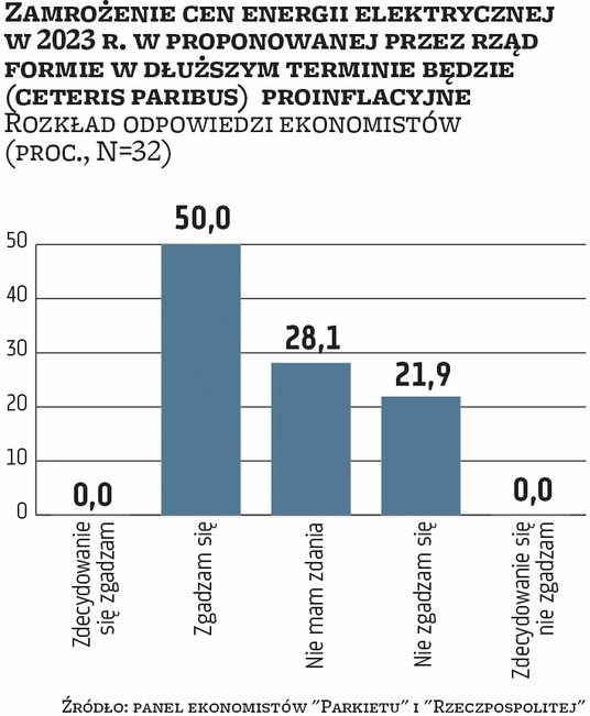 Zapytaliśmy o to członków panelu ekonomistów „Parkietu” i „Rzeczpospolitej”. Wnioski są niejednoznaczne. Z tezą, że „zamrożenie cen energii elektrycznej w 2023 r. w proponowanej przez rząd formie w dłuższym terminie będzie proinflacyjne”, zgodziła się połowa z 32 uczestników sondy. Żaden nie wybrał odpowiedzi „zdecydowanie się zgadzam”. Z kolei brak zgody z tą tezą zadeklarowało 22 proc. ankietowanych, ale i w tym gronie brakuje zdecydowania.